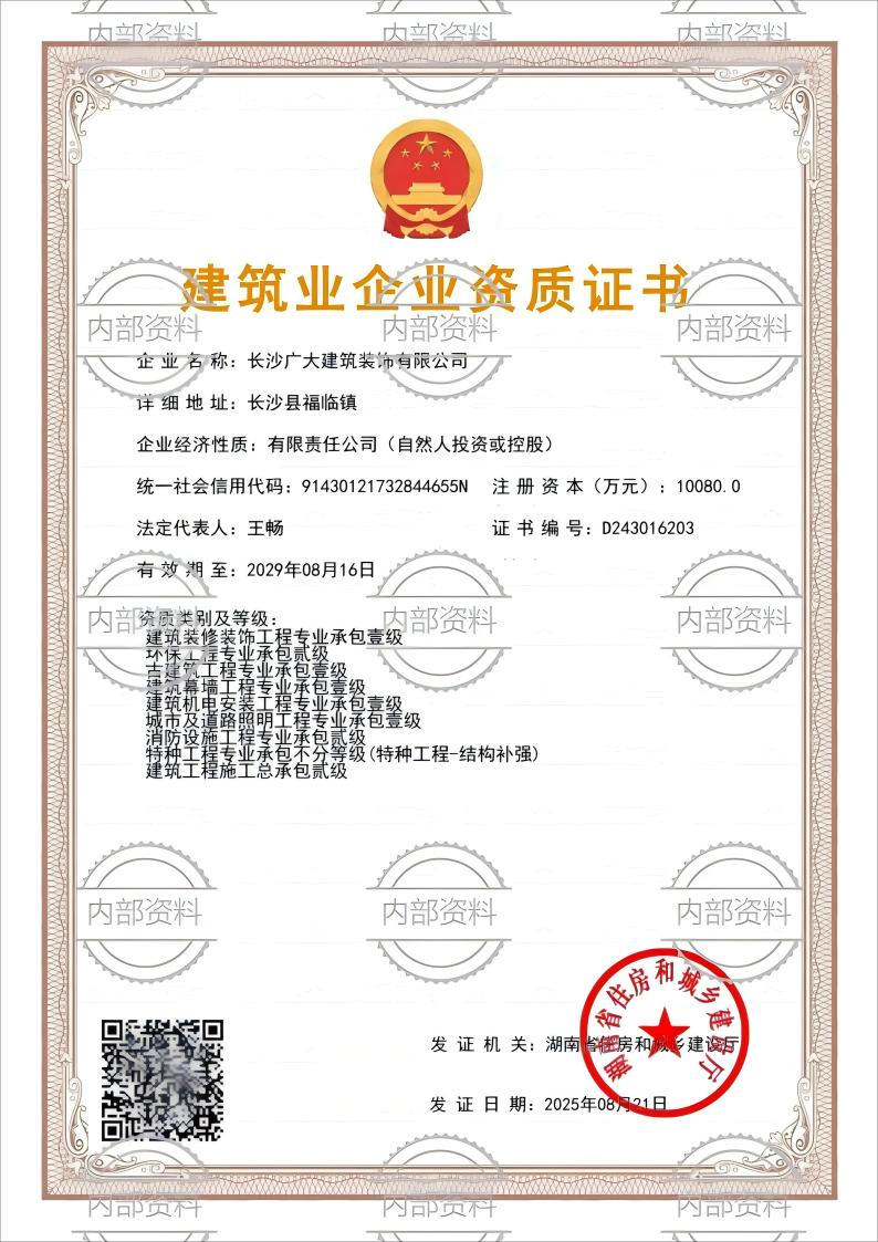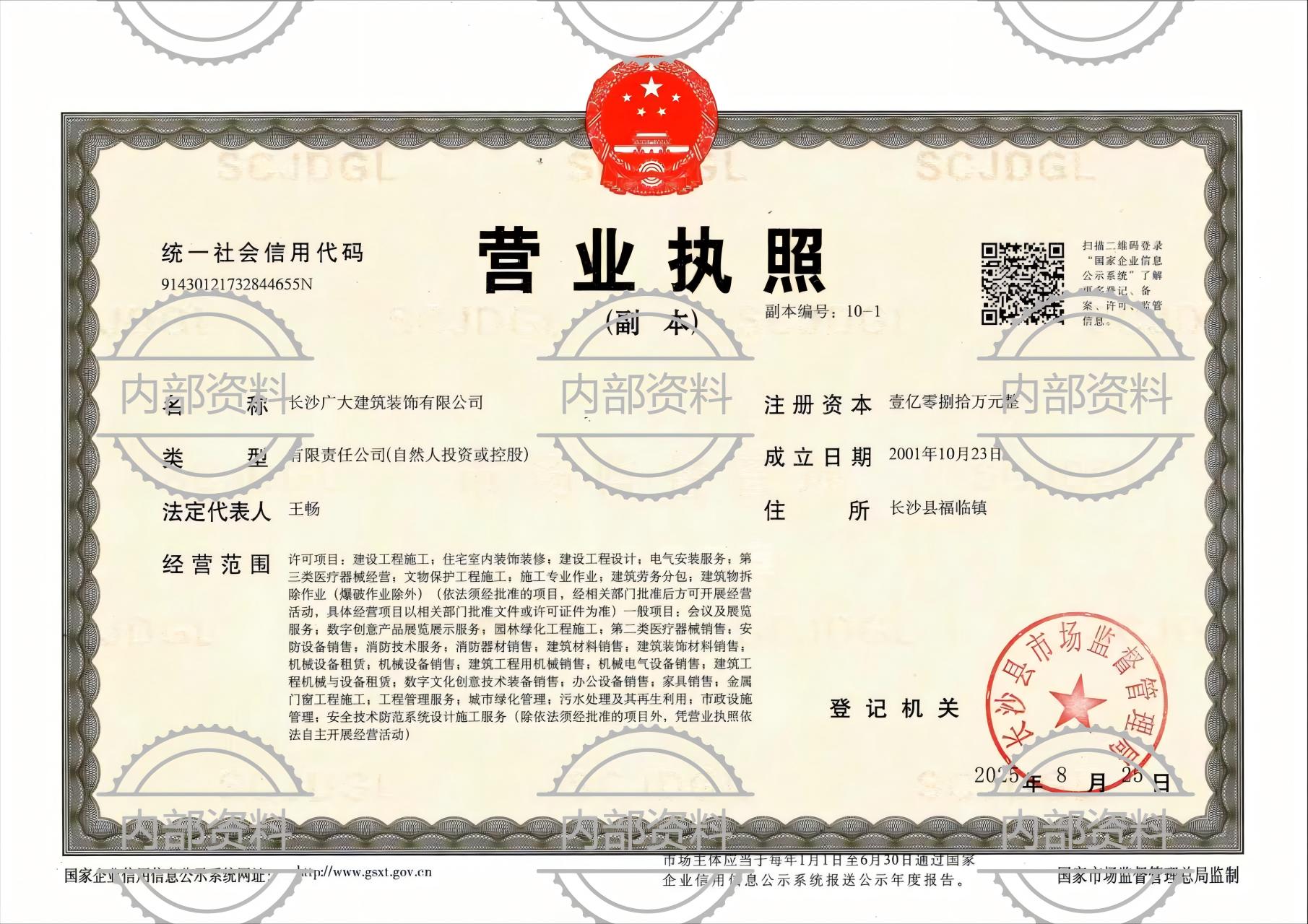 長(zhǎng)沙廣大建筑裝飾有限公司創(chuàng)建于1986年,注冊(cè)資本金10080萬(wàn)元,年產(chǎn)值近15億元,中國(guó)建筑裝飾協(xié)會(huì)會(huì)員單位、中國(guó)建筑裝飾行業(yè)百?gòu)?qiáng)企業(yè)、國(guó)家一級(jí)裝飾企業(yè);擁有北京、云南、天津等15家分公司及分支機(jī)構(gòu),一家控股房屋建筑工程總承包公司,兩家全資勞務(wù)公司,一家全資智能化專業(yè)承包公司,一家全資房產(chǎn)開發(fā)公司及一家全資物業(yè)公司。